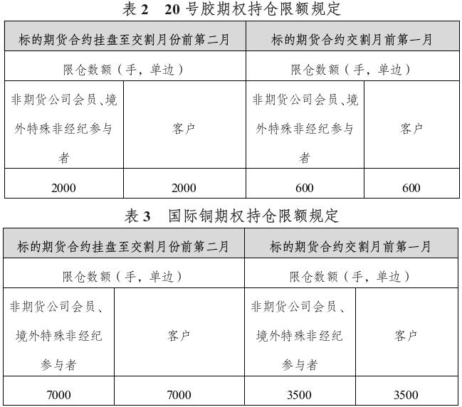 20号胶期权合约月份涉及的标的期货持仓量阈值为10000手(单边);国际铜期权合约月份涉及的标的期货持仓量阈值为5000手(单边)。